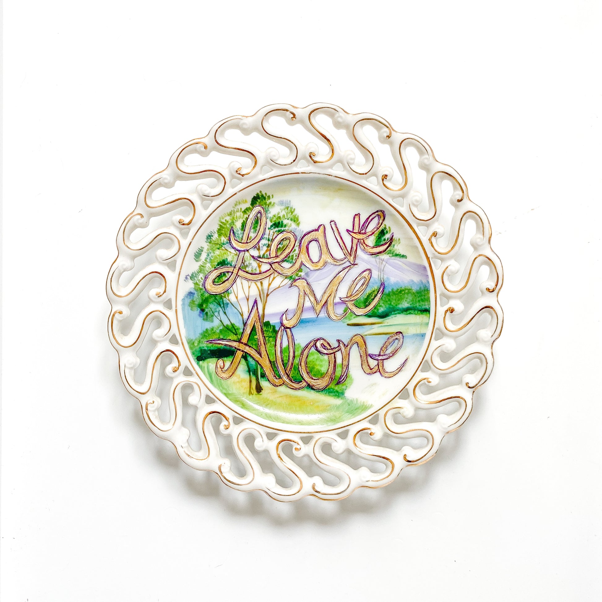 This 8.5-inch white decorative plate features a beautiful hand-painted HML leave me alone illustration atop a painted landscape by an unknown artist. The intricate, fine-line design adds a unique and artistic touch to any room—whether it’s displayed on a wall, used as a centerpiece, or simply added to your table. Its timeless yet personal feel makes it the perfect way to bring a little character and charm into your home.